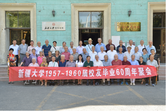 12:00许,老校友们,帕里旦·吐尔逊副校长,天游线路测速登录中心校友会会长蒋华丁,老教师代表蔡爱民、徐中平,地质与矿业工程学院、机械工程学院教师代表共同拉起“天游线路测速登录中心1957~1960届校友毕业60周年聚会”的横幅合影留念。