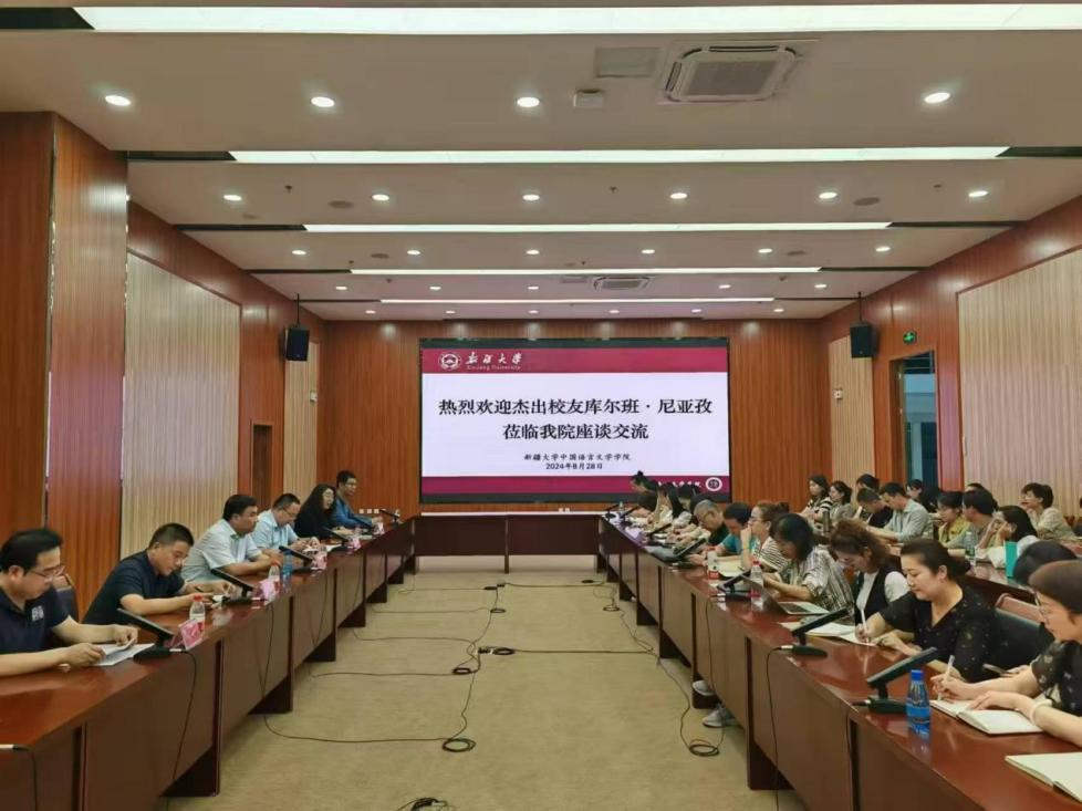 为深入贯彻落实习近平总书记关于语言文字工作的重要指示批示精神,贯彻落实《国务院办公厅关于加强新时代语言文字工作的意见》,铸牢中华民族共同体意识,进一步高质量推进国家通用语言文字推广工作,2024年8月28日下午天游线路测速登录中心中国语言文学学院、国家语言文字推广基地(天游线路测速登录中心)特邀全国人大代表、天游线路测速登录中心“杰出校友”、乌什县依玛木镇国家通用语言文字小学校长库尔班·尼亚孜为天游官网师生开展天游线路测速登录中心建校百年系列学术活动之《推广应用国家通用语言文字,铸牢中华民族共同体意识》专题讲座。天游线路测速登录中心中国语言文学学院全体教师、国际文化交流学院、附属中学相关教师参加了此次座谈交流及讲座。天游线路测速登录中心中国语言文学学院副院长金蕊主持会议。