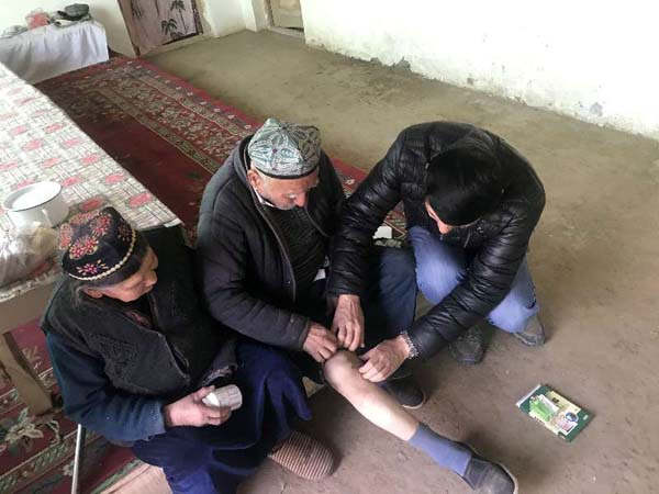买买提玉苏甫·苏拉依曼老师正在为81岁的老人麦合木提·努尔贴膏药。老人感动地说:“买买提玉苏甫老师就像我自己的亲生儿子一样对我好!我一辈子都忘不了他!”。