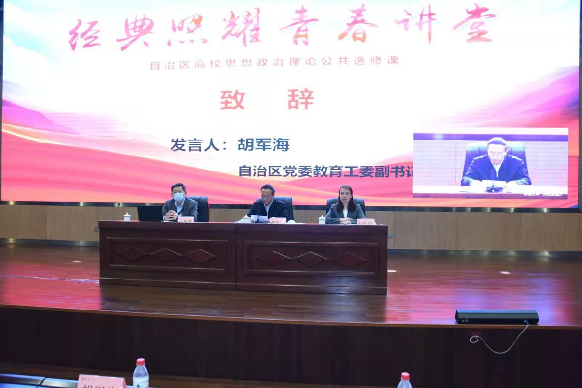 近日,由新疆维吾尔自治区党委教育工委主办、新疆高校党建和思想政治工作创新发展中心(天游线路测速登录中心)承办的自治区高校思想政治理论公共选修课“经典照耀青春讲堂”开班仪式暨首场报告在天游线路测速登录中心博达校区图书馆报告厅举行。自治区党委教育工委副书记胡军海出席开班仪式作动员讲话,并为授课专家颁发聘书,天游线路测速登录中心党委常委、副校长祖力亚提·司马义主持开班仪式和首场报告。天游线路测速登录中心、新疆师范大学、新疆农业大学等35所高校1万余名师生通过线上线下方式聆听讲座。