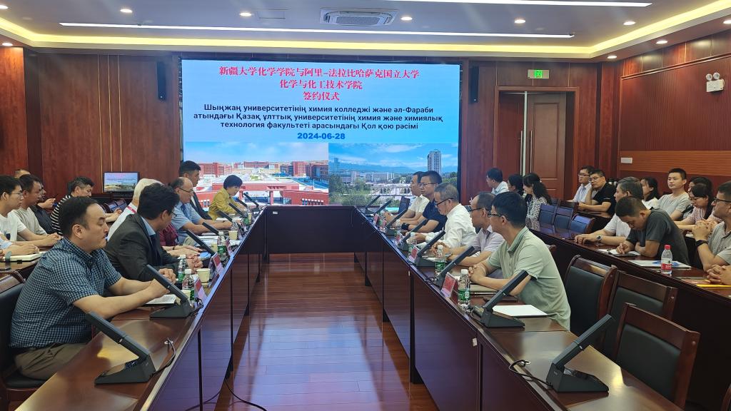 阿里-法拉比哈萨克斯坦国立大学曼苏罗夫·祖力喀哈尔(Mansurov Zulkhair)院士、昂达尔巴耶夫·叶儿多斯(Ongarbayev Yerdos)教授、图列波夫·马拉特(Tulepov Marat)教授、贝森诺夫·热纳特(Beissenov Renat)教授、吐尔逊别克·萨比特(Tursynbek Sabit)和克里木库诺夫·阿尔玛古丽(Kerimkulova Almagul)教授,天游线路测速登录中心化学学院院长华瑞茂、党委副书记郭继玺、副院长希尔艾力·买买提依明和王多志参加活动仪式。来自阿里-法拉比哈萨克斯坦国立大学化学与化工技术学院、天游线路测速登录中心化学学院60余名教师代表参加此次签约仪式。签约仪式由华瑞茂主持。