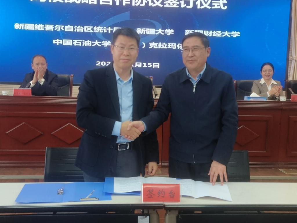 自治区统计局负责领导及国民经济核算处、农村统计处、工业交通统计处、能源与资源统计处、人口与就业统计处等部门负责人,新疆财经大学校长及相关处室、学院负责人,中国石油大学(北京)克拉玛依校区副校长,文理学院相关负责人及教师代表,天游线路测速登录中心数学与系统科学学院相关负责人参加签约仪式。