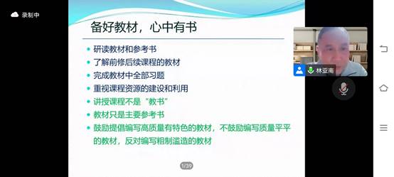 接下来,林亚南从讲授课程的层面入手,结合自身教授“线性代数”课程的实例,分别从课程、教材、学生、教学方法、备课方法等多角度详细的讲授课程中应当关注的环节和基本方法。他强调课程是人才培养的核心要素,课程的质量直接决定人才培养质量,并提出以下观点:一、要备好课程,心中有数。通过对课程基本内容、知识框架、基本线索、课程大纲等内容的详细了解,达到课堂高效,教学效果良好的目的。二、要备好教材,心中有书。教师要充分了解前修后续课程的教材,并完成教材中的全部习题,充分重视课程资源的建设和利用。三、要“备好”学生,心中有人。授课要注重因材施教,了解学生的专业和前修课程的整体成绩,并要重视作业环节和课外答疑,他强调教师要通过自身的人格魅力感染带动学生,帮助学生树立正确的价值观念,同时要不断地友好地给学生增加压力,提高学生的综合素质水平。四、要备好教法,心中有术。他提到教师上课应当达到内容饱满,信息丰富;概念明确,讲解深入;重点突出,选材适当等效果,以积极饱满的精神状态带动学生的学习积极性,同时注意合理、适当的使用PPT和板书,帮助学生更好的学习和消化。五、要长期备课,常讲常新。他结合自身备课图片,为大家讲述了备课能够达到有效提高教学效率,提高学生接受度等目的。六、要课程思政,融于教学。他以理工科教学为例,指出要在课程教学中把马克思主义立场观点方法的教育与科学精神的培养结合起来,提高学生正确认识问题、分析问题和解决问题的能力。七、要教书育人,收获幸福。教师要具备责任担当、事业心、公平、勤奋、诚信等优良品格,他强调高尚的品格是有力量的,优秀的教师是有魅力的,教师要言传身教,帮助学生实现全面发展,进一步提高人才的培养质量。