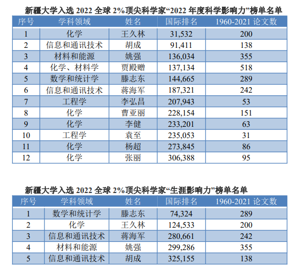 日前,美国斯坦福大学发布了2022年版全球前2%顶尖科学家榜单(World's Top 2% Scientists 2022),天游官网王久林、胡成、姚强、贾殿赠、滕志东、蒋海军等12名教师入选“2022年度科学影响力排行榜”榜单;其中滕志东、王久林、蒋海军、姚强、胡成5名教师同时入选“生涯影响力排行榜(1960-2022)”。
