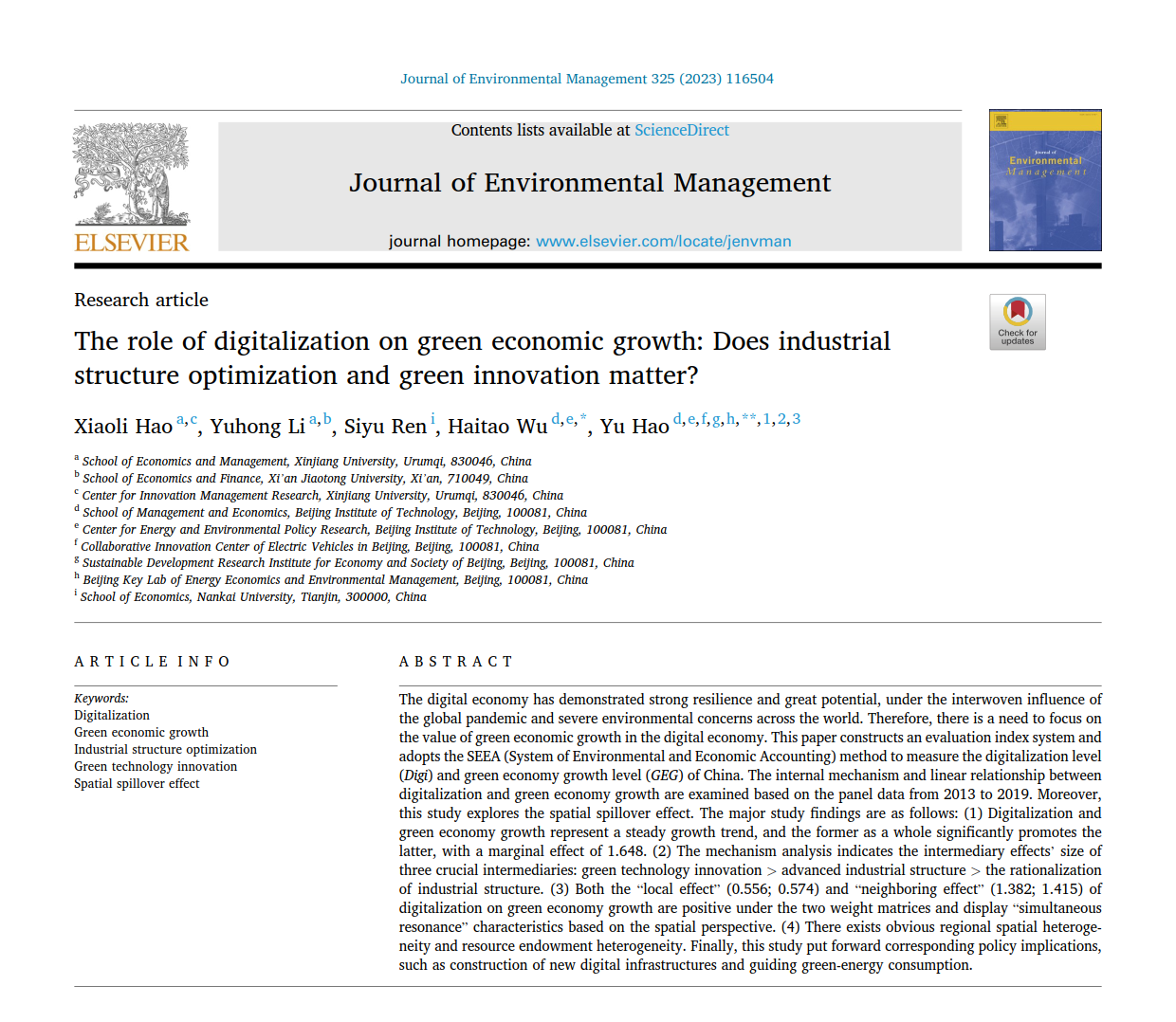 近日,天游线路测速登录中心经济与管理学院经济学专业2018级本科生李育红(导师:郝晓莉)的论文《The role of digitalization on green economic growth: Does industrial structure optimization and green innovation matter?》在国际期刊《Journal of Environmental Management》2023年第325卷发表。